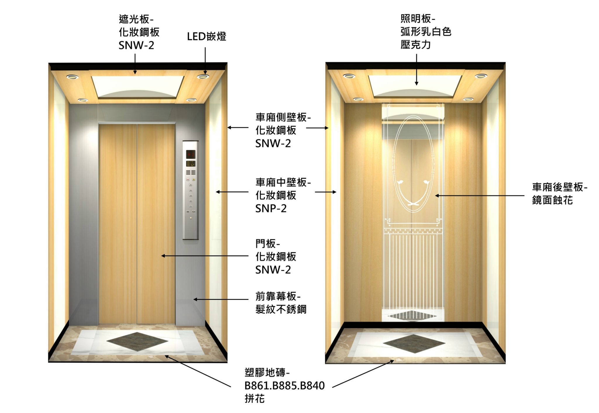 廂壁:鋼板貼美耐板 廂門:鋼板貼美耐板 出入口上板:髮紋不鏽鋼板 出入口門柱:髮紋不鏽鋼板 地板:PVC塑膠地磚 壓條:鋁質銀色陽極處理 叫車面板:髮紋不鏽鋼板 天花板:鋼板烤漆